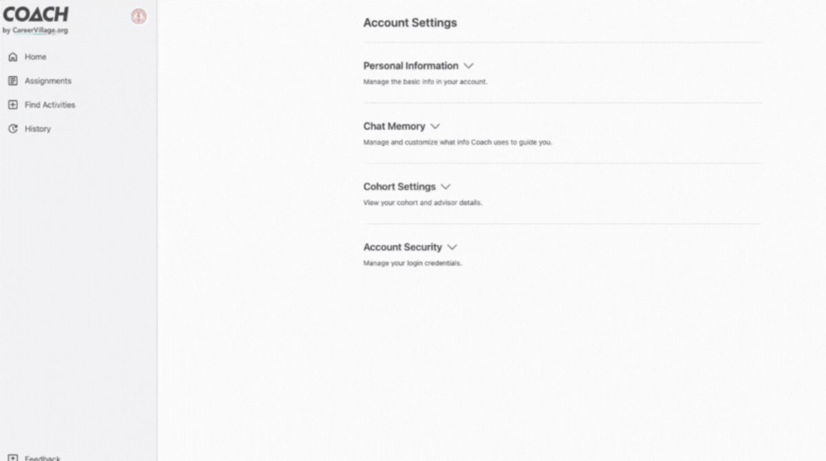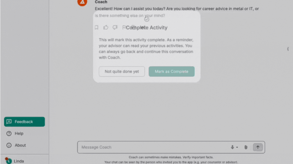 When Coach is using its tools to search or analyze information, a short loading message now appears: “Thinking and searching websites we trust.” This helps learners understand what Coach is doing and builds confidence that responses are grounded in reliable sources.